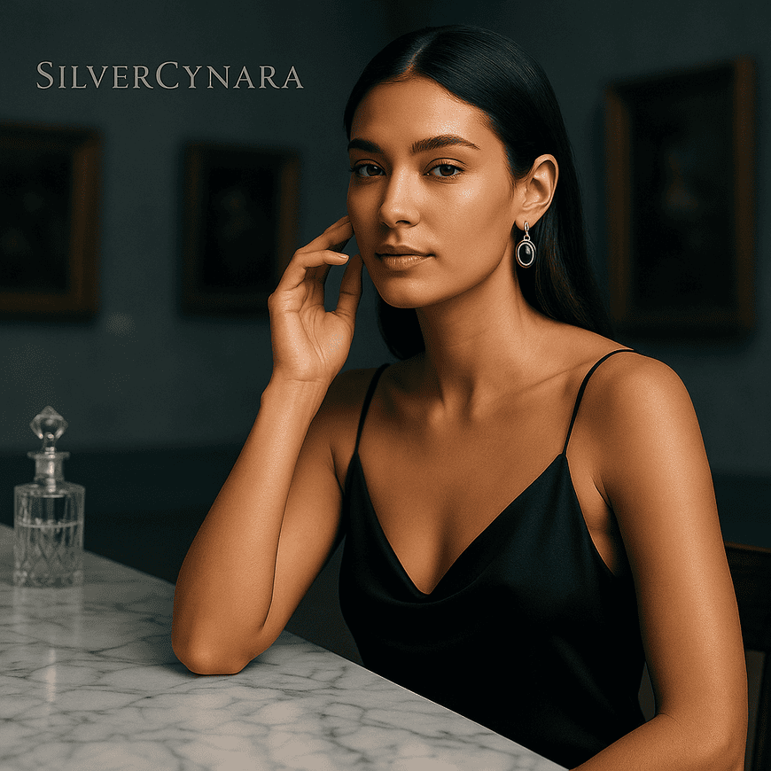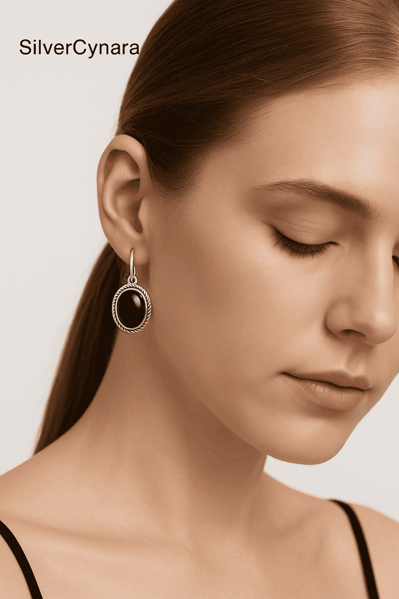 Command attention with these bold sterling silver dangle earrings, featuring striking synthetic black stones. Their dramatic contrast and sculptural style make them a powerful accent for any look.