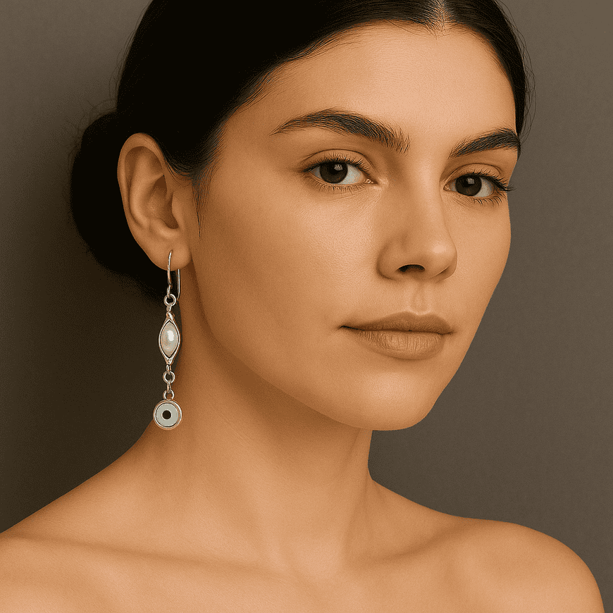 These 925 silver dangle earrings blend luminous mother of pearl with freshwater pearls in a modern evil eye design. Symbolic and stylish, they bring both elegance and a touch of protective charm.