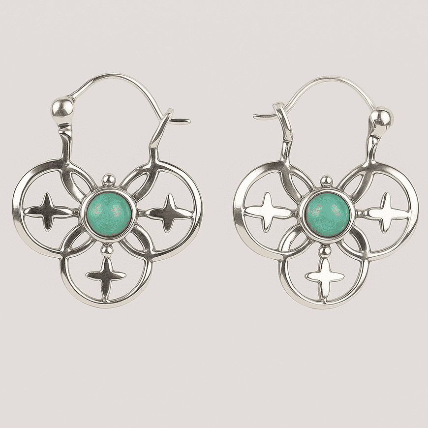 Silver Hoop Earrings in a Quatrefoil Design with Green Stone